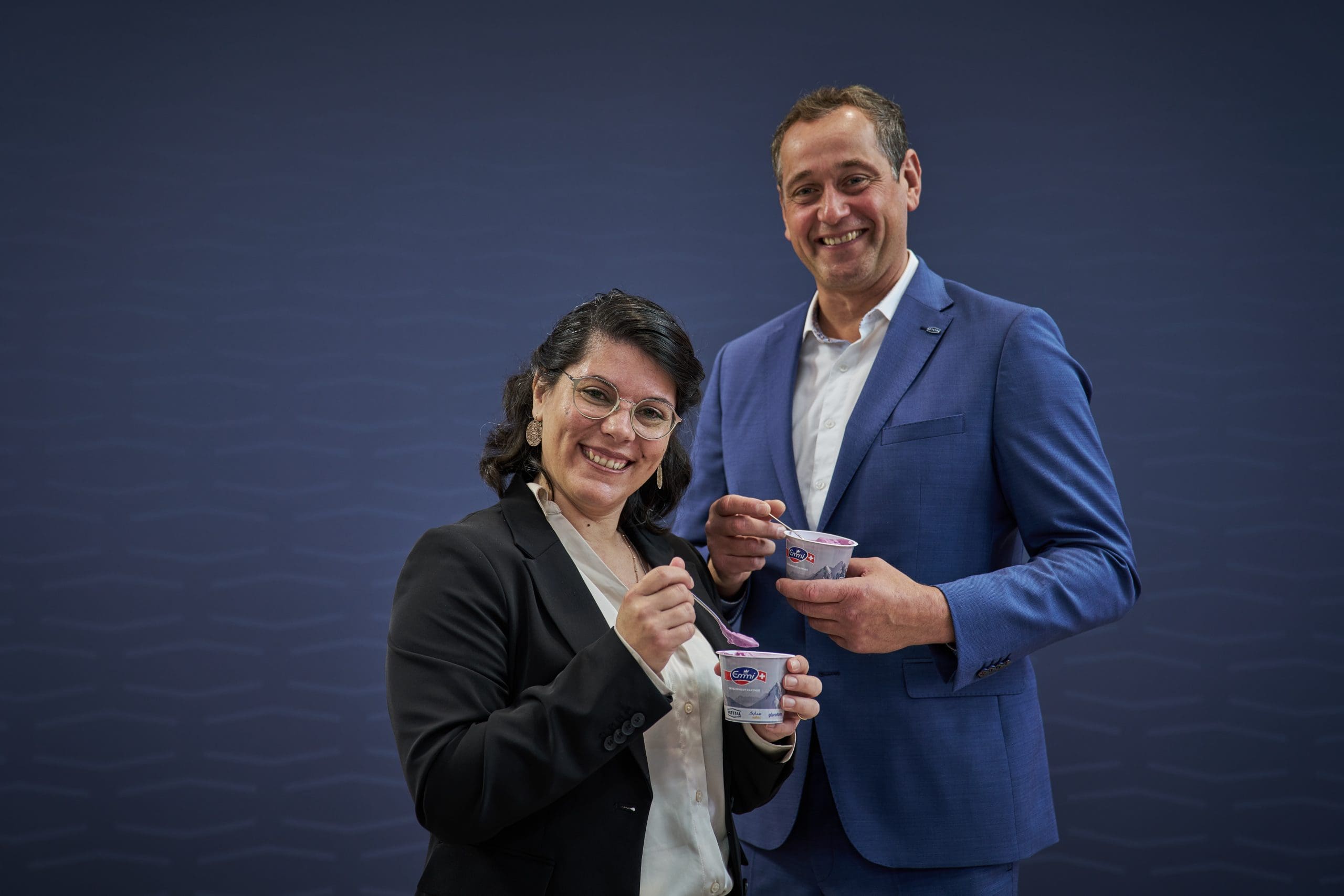 Entwicklungspartner Emmi hat kurz vor der Fakuma auf seinen Anlagen vorproduzierte Musterbecher abgefüllt und im Anschluss nach Friedrichshafen geliefert. Auf dem Messestand haben wir unseren Gästen im Showbecher abgefüllten Skyr serviert. Ein wohlschmeckender Beweis, dass unsere Lösung in der Praxis einwandfrei funktioniert.