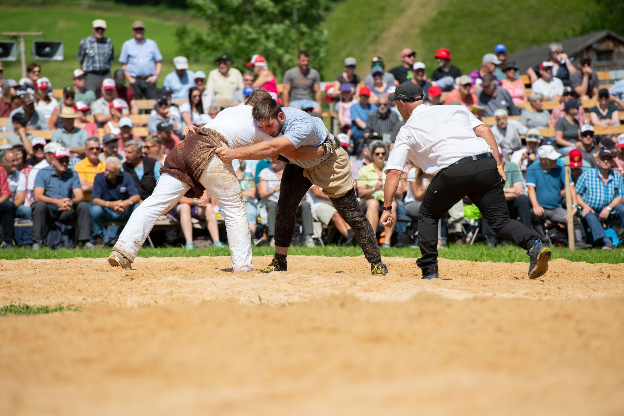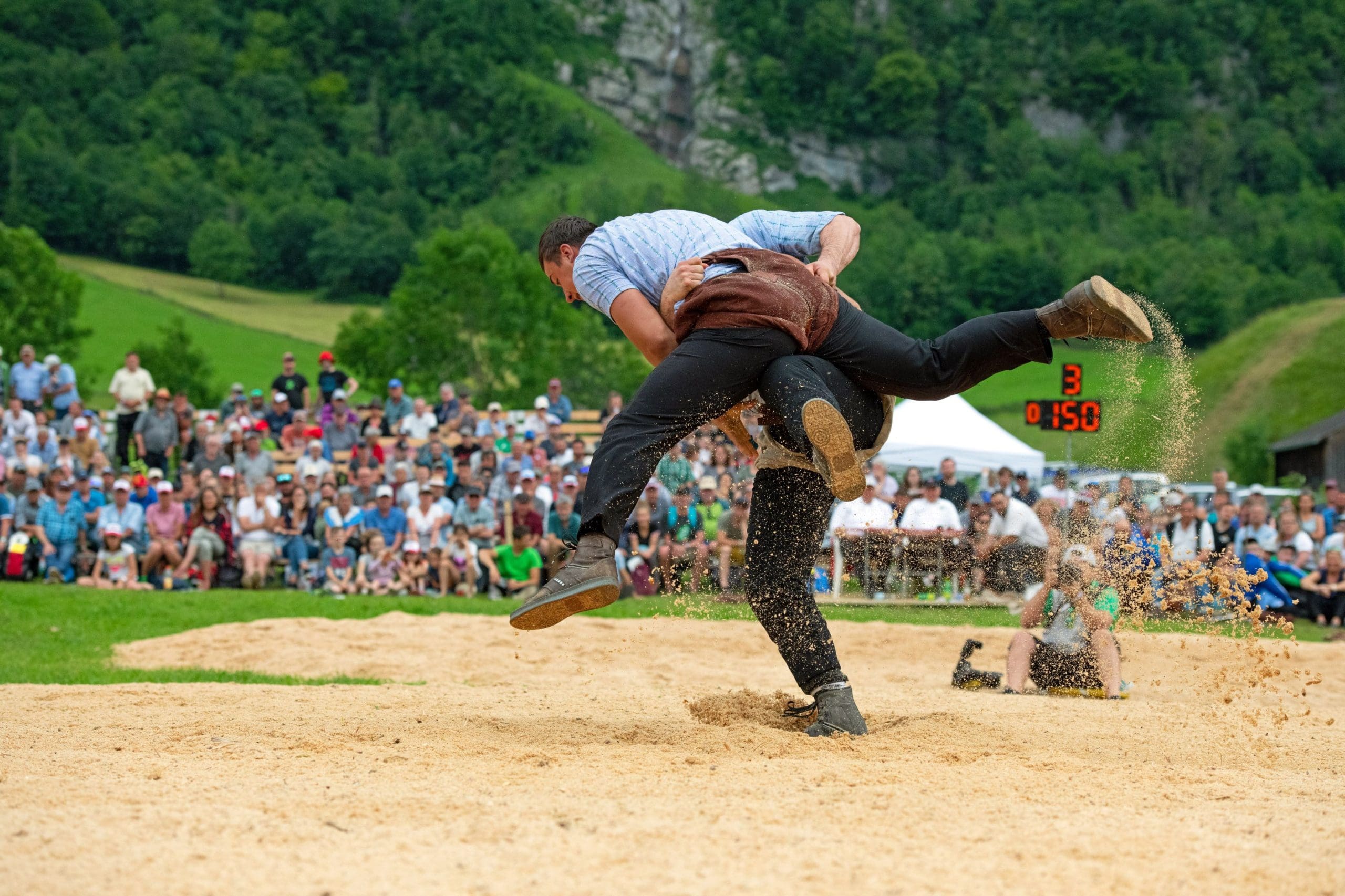 Das ist Schweizer Brauchtum vom Feinsten: Das Eidgenössische Schwing- und Älplerfest, kurz ESAF, findet alle drei Jahre an wechselnden Orten statt und zieht regelmässig über 400.000 Zuschauer an, was es zum grössten wiederkehrenden Sportanlass der Schweiz macht. Beim ESAF messen sich die besten Schwinger des Landes im traditionellen Schweizer Ringkampf Schwingen, begleitet von Wettbewerben im Steinstossen und einer grossen Festkultur mit Jodlern, Fahnenschwingern und Alphornbläsern. Der Sieger erhält den prestigeträchtigen Titel „Schwingerkönig“ sowie als Lebendpreis einen ausgewachsenen Stier, den sogenannten «Muni».