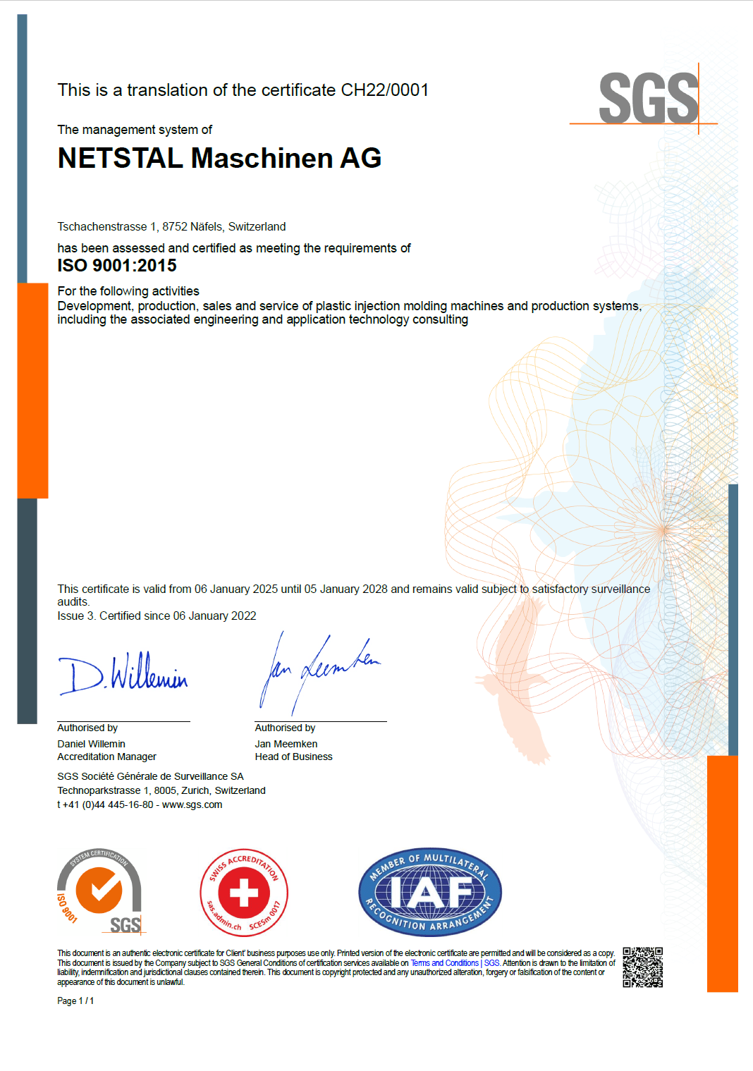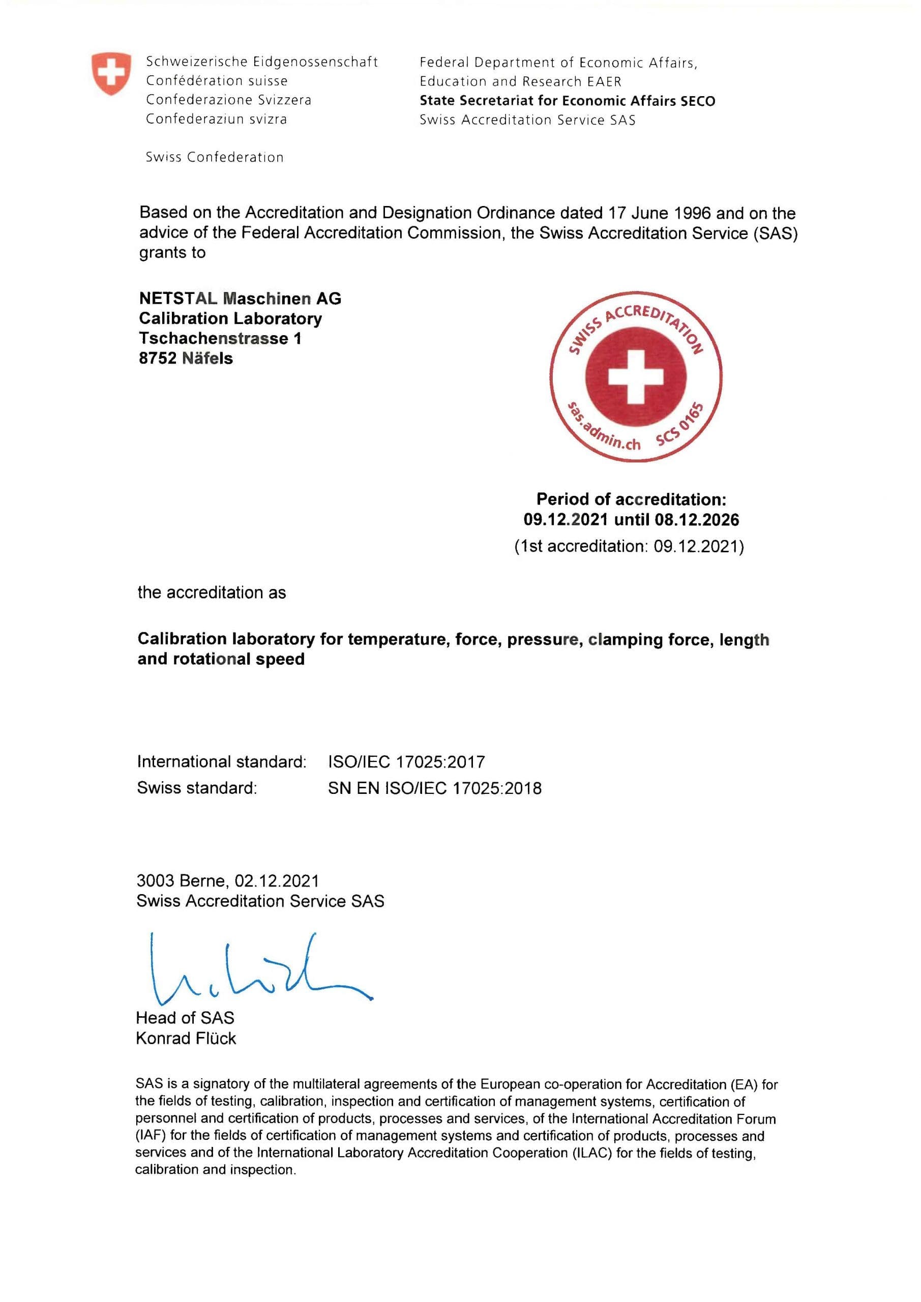 Netstal erhält von der Schweizerischen Akkreditierungsstelle SAS die Akkreditierung als Kalibrierlabor. Damit kann das Unternehmen Maschinenkalibrierungen nach ISO/IEC 17025:2017 anbieten und durchführen